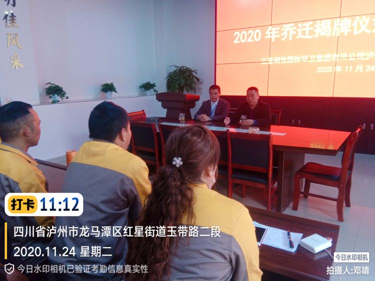 2020年11月24日,明佳集團(tuán)瀘州分公司新辦公室喬遷儀式隆重舉行。人大主任詹萬(wàn)勇,區(qū)綜合行政執(zhí)法局環(huán)衛(wèi)股股長(zhǎng)趙耿、重慶中仁公司昌總等領(lǐng)導(dǎo)來(lái)到明佳集團(tuán)瀘州分公司新辦公場(chǎng)地,為煥然一新的辦公樓正式啟用進(jìn)行喬遷揭牌。集團(tuán)公司生產(chǎn)質(zhì)安部副經(jīng)理鞠彬、集團(tuán)公司生產(chǎn)質(zhì)安部副經(jīng)理段永強(qiáng)、綜合辦公室、財(cái)務(wù)部、各部門管理人員共同見證這一歡慶時(shí)刻。