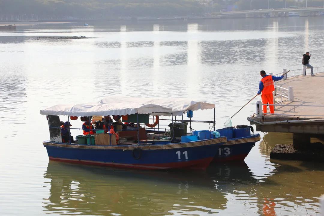 每天工作都是從早上7點(diǎn)鐘到下午的6點(diǎn)半,我們是分段來的。主要是坐船去收集河上的一些垃圾,一天巡邏清掃一次,清掃完了回來再巡邏保潔。水面和紅樹林里的垃圾都要清理。下雨天我們也要出來(工作),臺(tái)風(fēng)天就要做好防風(fēng)的工作,如果是下雨,我們一樣要出來打撈垃圾。